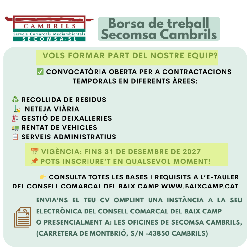 Secomsa Cambrils obre una borsa de treball per cobrir diferents llocs de treball.