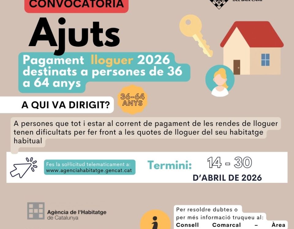 L’Agència de l’Habitatge de Catalunya ha obert aquest dimarts 14 de d’abril de 2026 la convocatòria per demanar els ajuts per al pagament de lloguer per facilitar l’accés i la permanència en un habitatge en règim de lloguer a persones que tinguin de 36 a 64 anys.